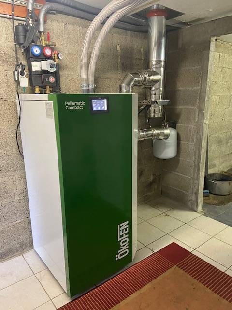 Dans cette maison du Centre Bretagne, installation d'une chaudière à granulés de bois Pellematic Compact de 12 kW de marque ÖkoFen suite au remplacement de la vielle installation au fioul.