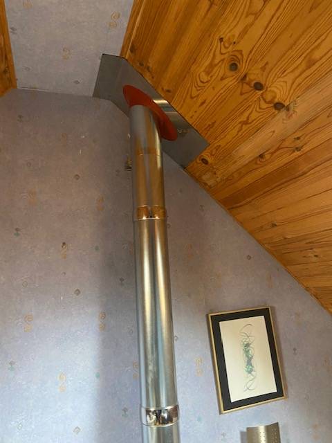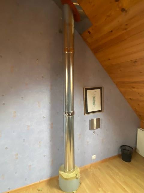 Le choix de l'emplacement s'est porté sur un garage inutilisé qui comportait une chambre au dessus. Il a donc fallut traverser le plancher de celle-çi puis la toiture en tenant bien compte des écarts au feu par rapport à tout matériaux inflammables.