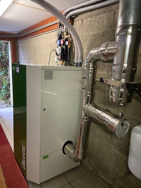 Suite à l'installation d'une chaudière à granulés de bois de marque ÖkoFen, il a été nécessaire par rapport à la réglementation sur la fumisterie de modifié l'emplacement de la chaudière Pellematic Compact et donc de sa sortie de fumée.