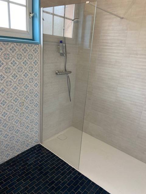 Dans cette salle de bain, la baignoire a été remplacée par un receveur de douche de marque Mc Bath, de même taille que celle-ci, pour une pose « à l’italienne ».