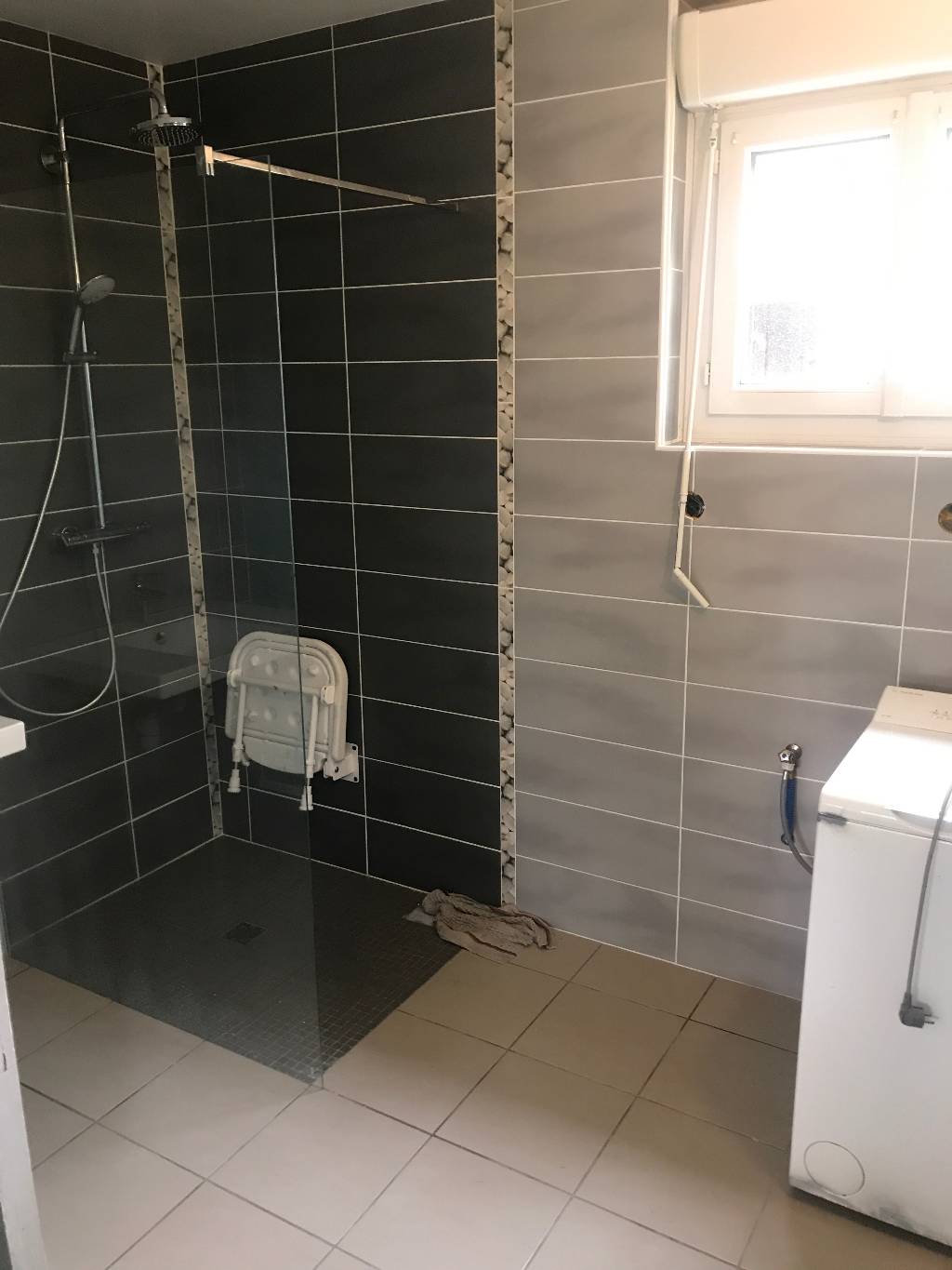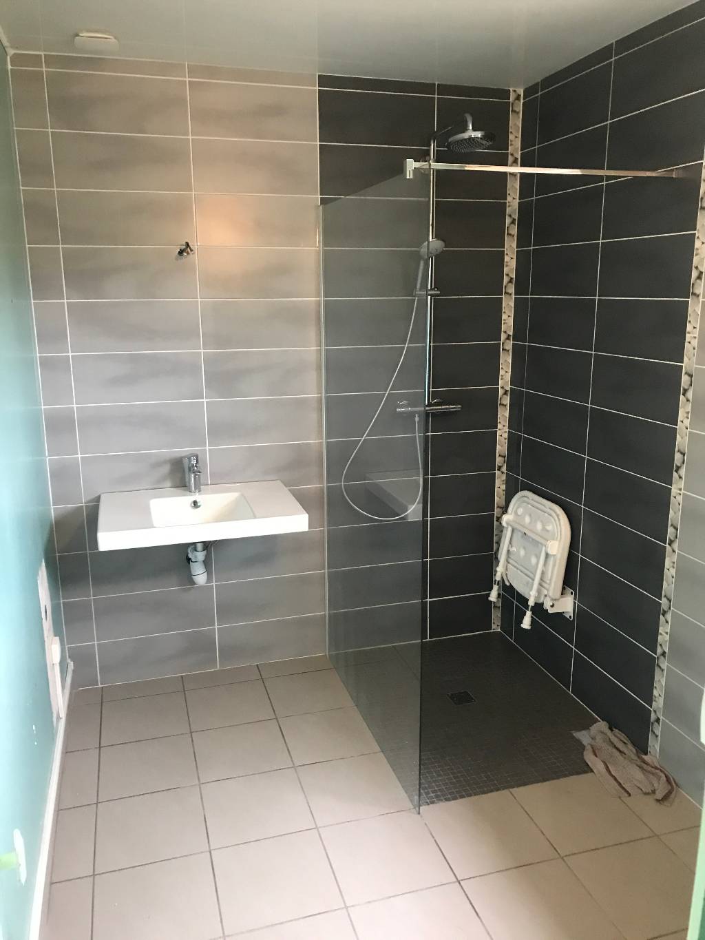 Rénovation complète d'une salle d'eau avec pose d'un receveur à l'italienne, d'un siège afin que la cliente puisse prendre une douche confortablement et d'un wc surélevé de chez Jacob Delafon.